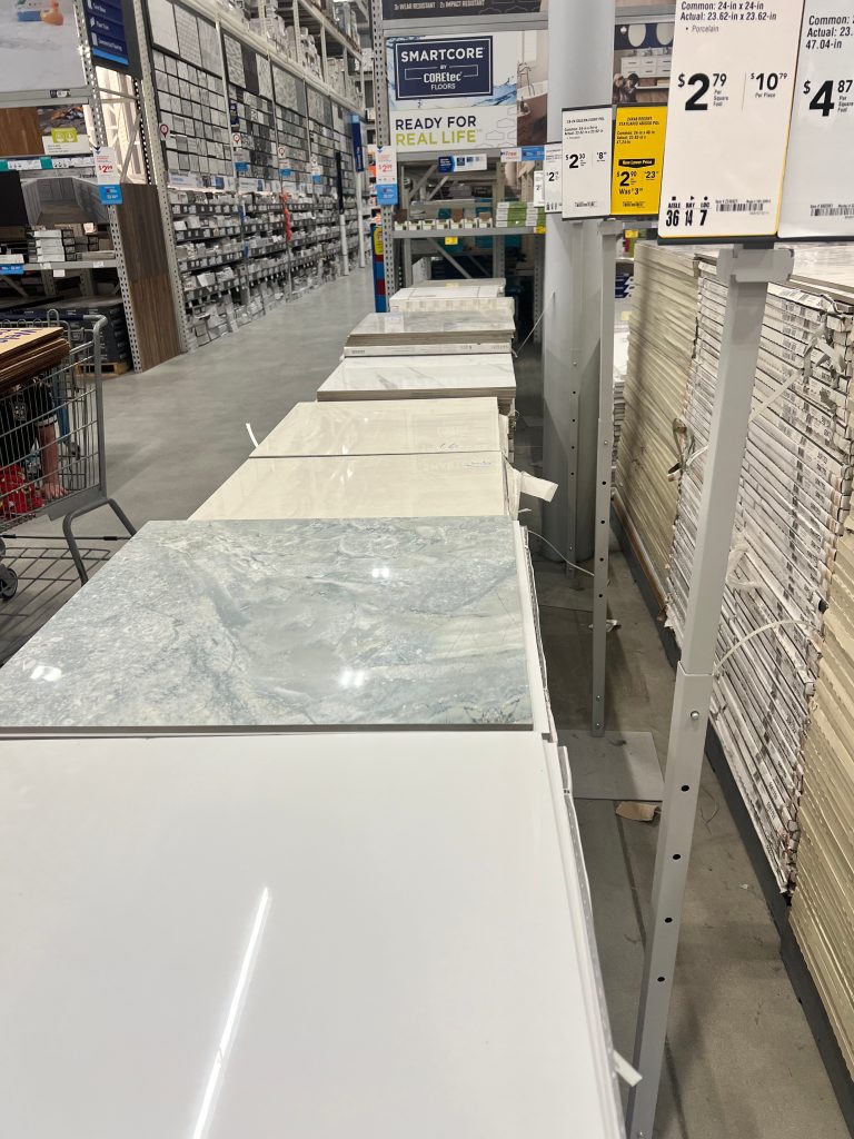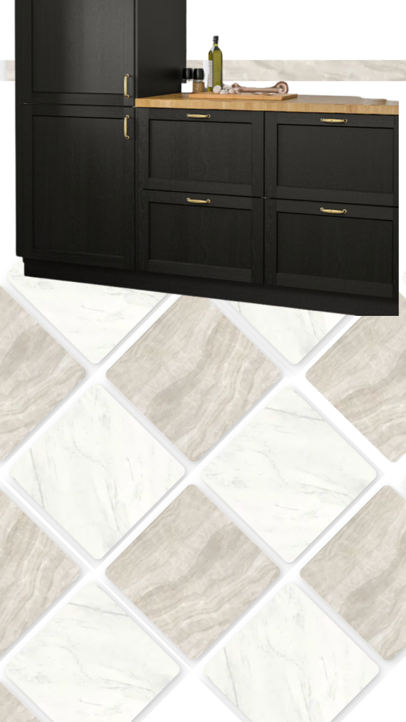 After a deep dive online, I found Bedrosians tile, which had a fantastic selection of porcelain options, including some with beautiful marble-like finishes. I ordered samples in different tones to find the perfect pairing for our checkerboard pattern. One of the biggest selling points? The tiles came in a large 30″x30″ size, which minimized grout lines and kept the design from feeling too busy—unlike the more common 18″x18″ or even 24″x24″ sizes.