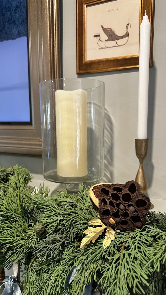 I love the look of a garland draped across a mantle — but it has to be high-quality for me. Nothing ruins a beautiful room faster than a sparse or plastic-looking garland. This one from Wayfair is absolutely gorgeous, full and lush, with a realistic texture that instantly elevates the whole room. I used two strands to give it that layered, overflowing look I love. To add a soft glow in the evenings, I placed hurricane glasses with flameless candles on either side of the mantle. They cast the prettiest flickering light — enough to make the room feel cozy, but not so bright that it distracts from a movie night.