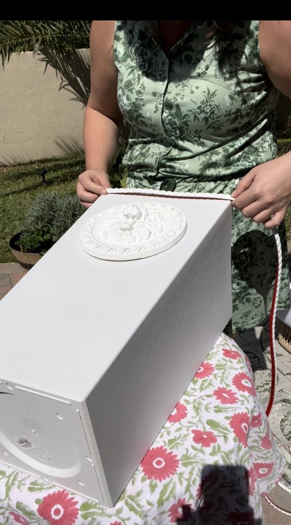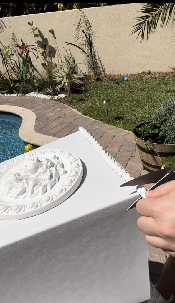 Then, I found this primed lions head medallion. They’re safe to use indoors or outdoors, can be glued or screwed, and were the perfect size for my planters! Look how giddy I am at the look. HAHA