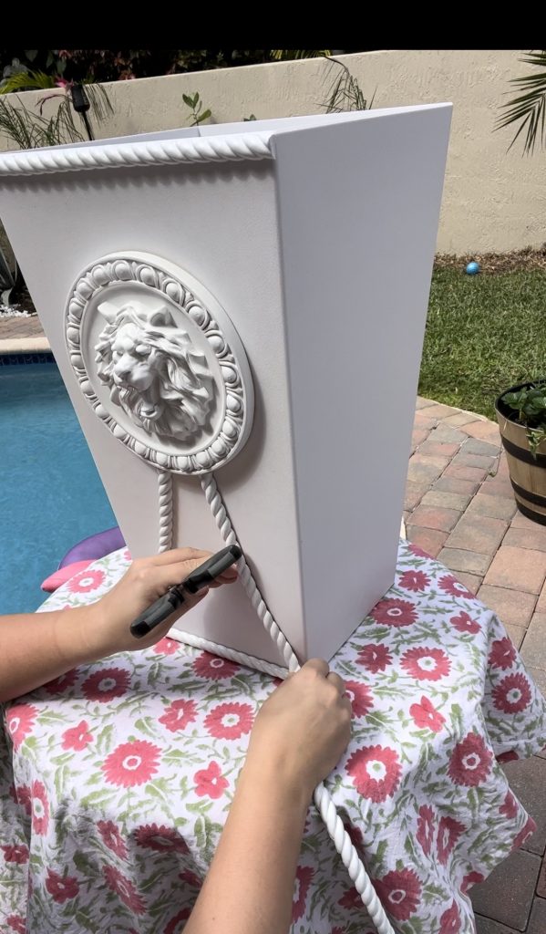 First, I found these 20″ white garden planters. You could also use a pot you have on hand. I chose white so that it matched the lions head and trim, without having to spray paint. But if you find a deal on a colored pot, I think go for it!