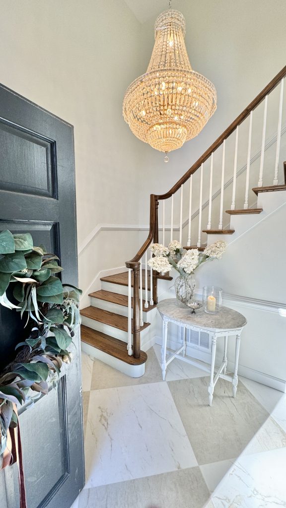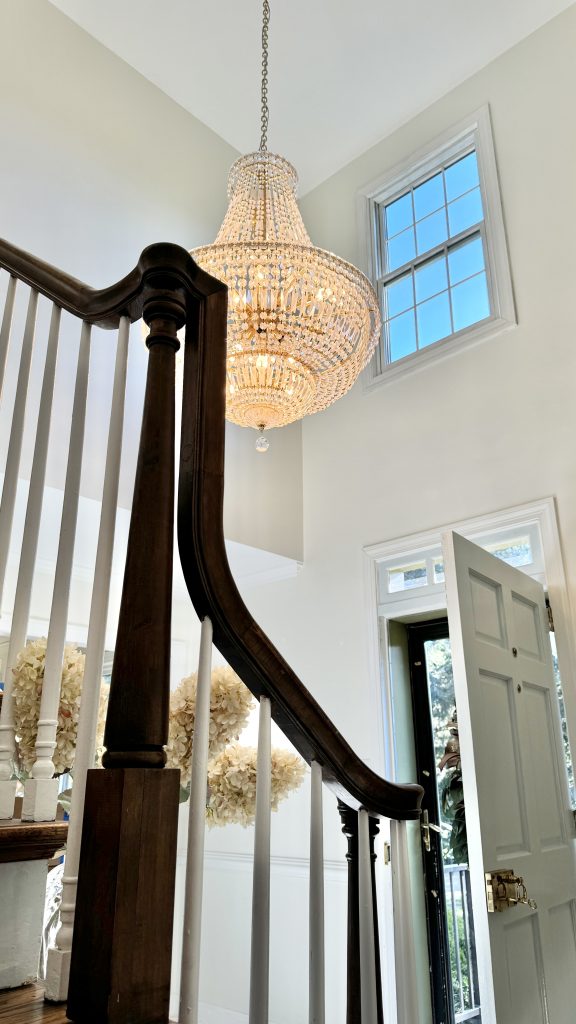 Today’s been a big day in our house. After a year of storing our crystal chandelier from FBMP, we finally are having it hung in our foyer!
