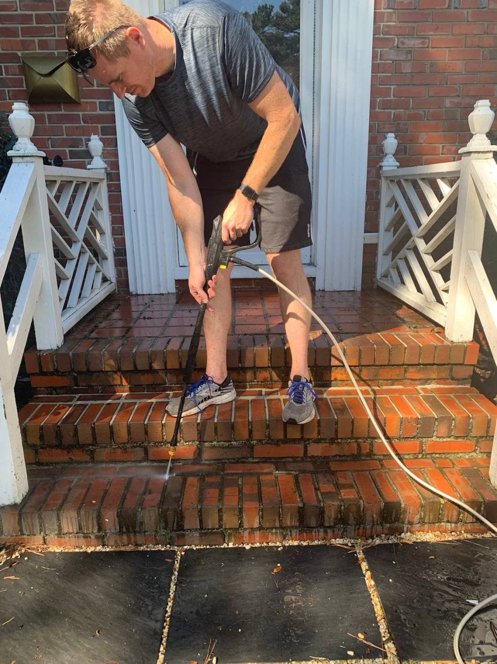You’ll want a clean surface so that your lime wash can adhere onto the brick. Especially behind bushes and close to the ground, you may notice moss or green slime in the grout of your brick. Be sure to get all of that off. Here’s our pressure washer we used.