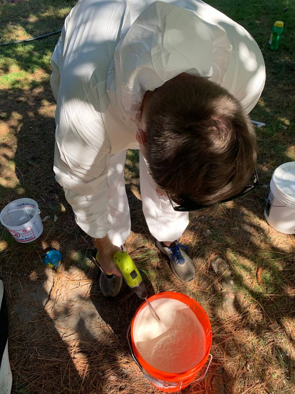 We then attached this paint mixer to our drill and mixed up the lime wash this way. I’d highly recommend this tool! It does a great job of mixing the lime wash thoroughly. The mixture can be pretty dense, so you really need some power to incorporate the water into it. Imagine mixing water into mud. It’s kind of like that.