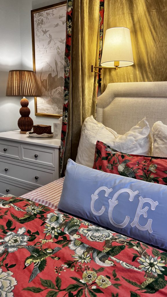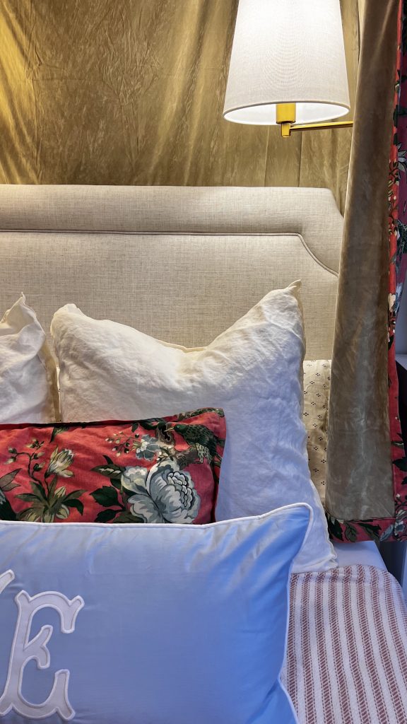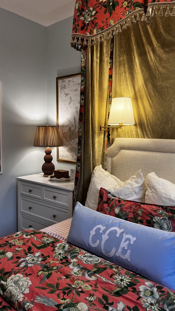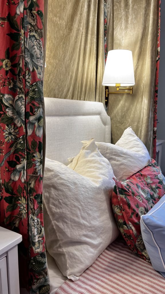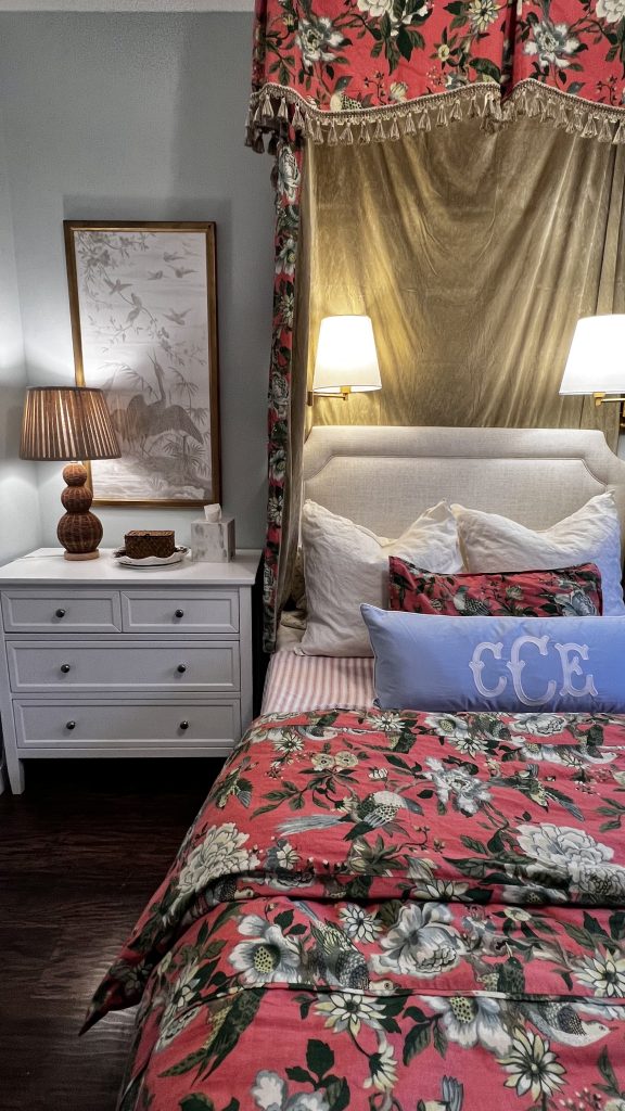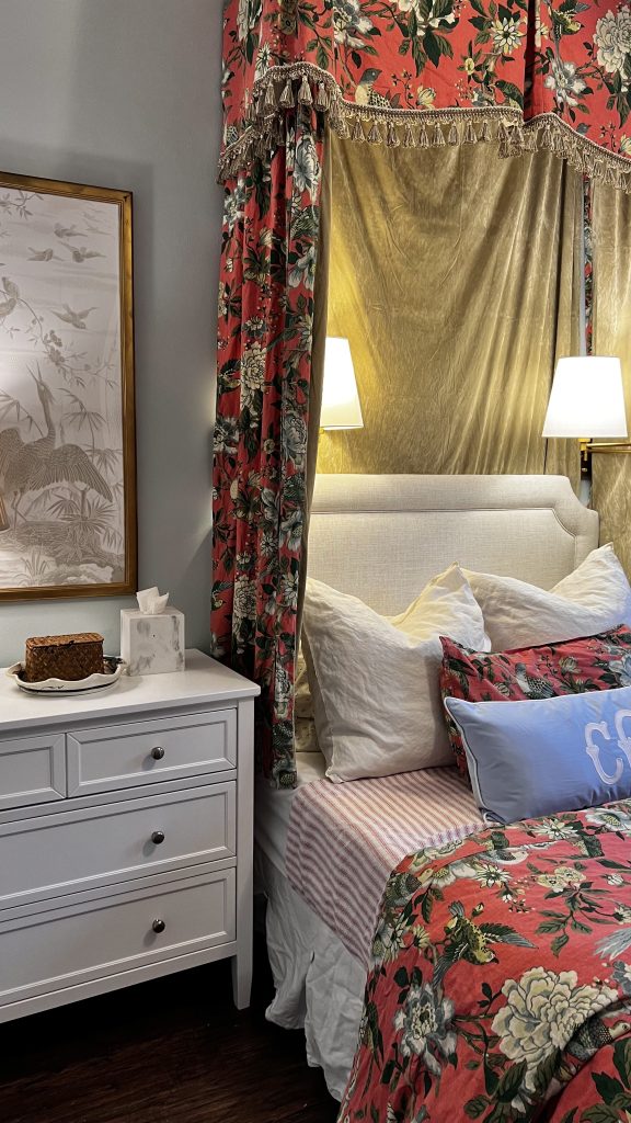 I found these canopies, matching bedding, and curtains at an estate sale in Norfolk, VA in 2021. They actually belonged to one of my children’s teachers, and she was able to give me a little insight into them. She had a designer make them years before – everything was custom, and it showed.