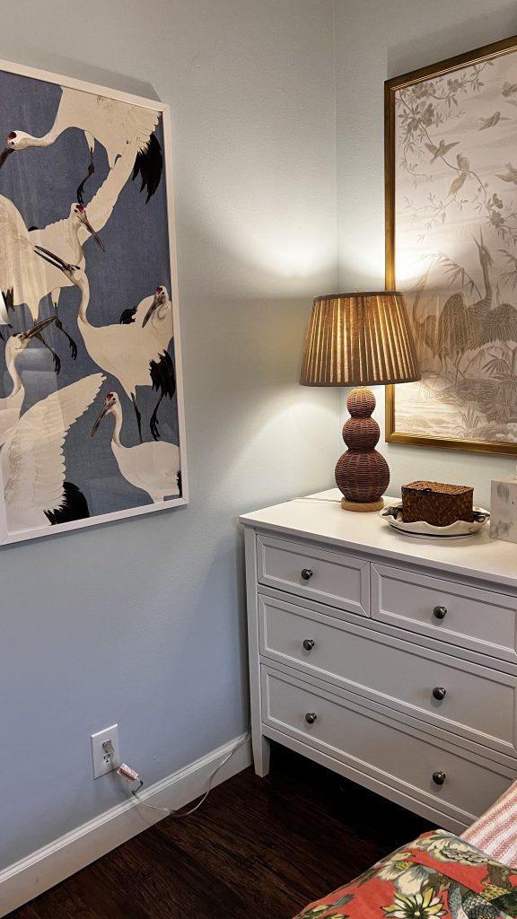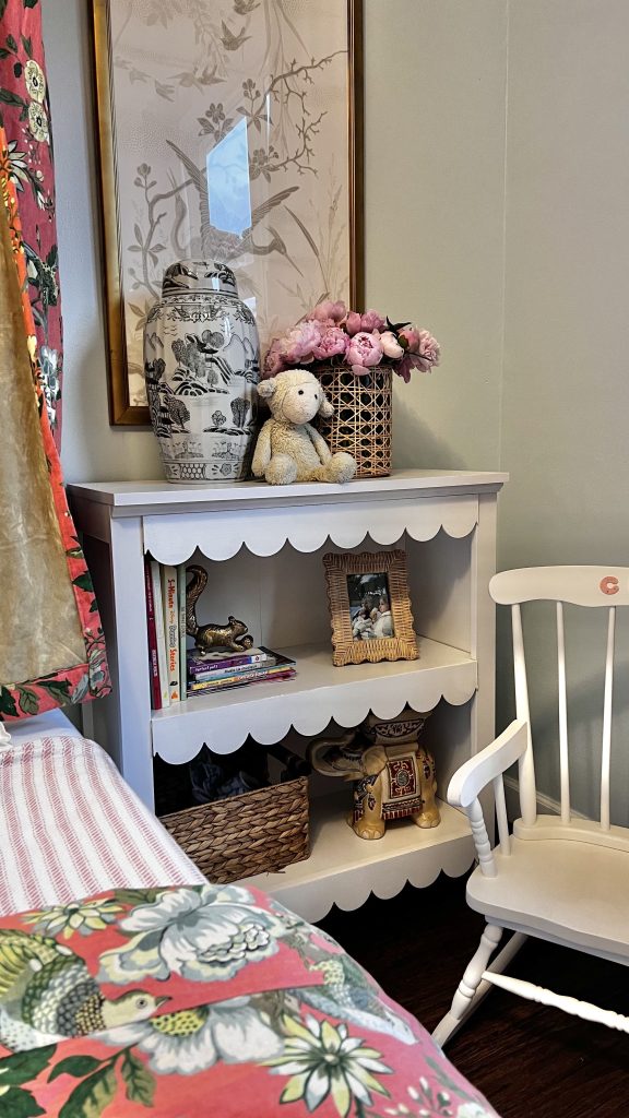 I stashed them away for the next house and finally got the chance to use them. I was delighted when my four year old daughter said she wanted one over her bed. She loves birds, so it really fit her style. She also loves blue, so I brought more of the blue in the fabric to the forefront with a monogrammed pillow – and her wall color.