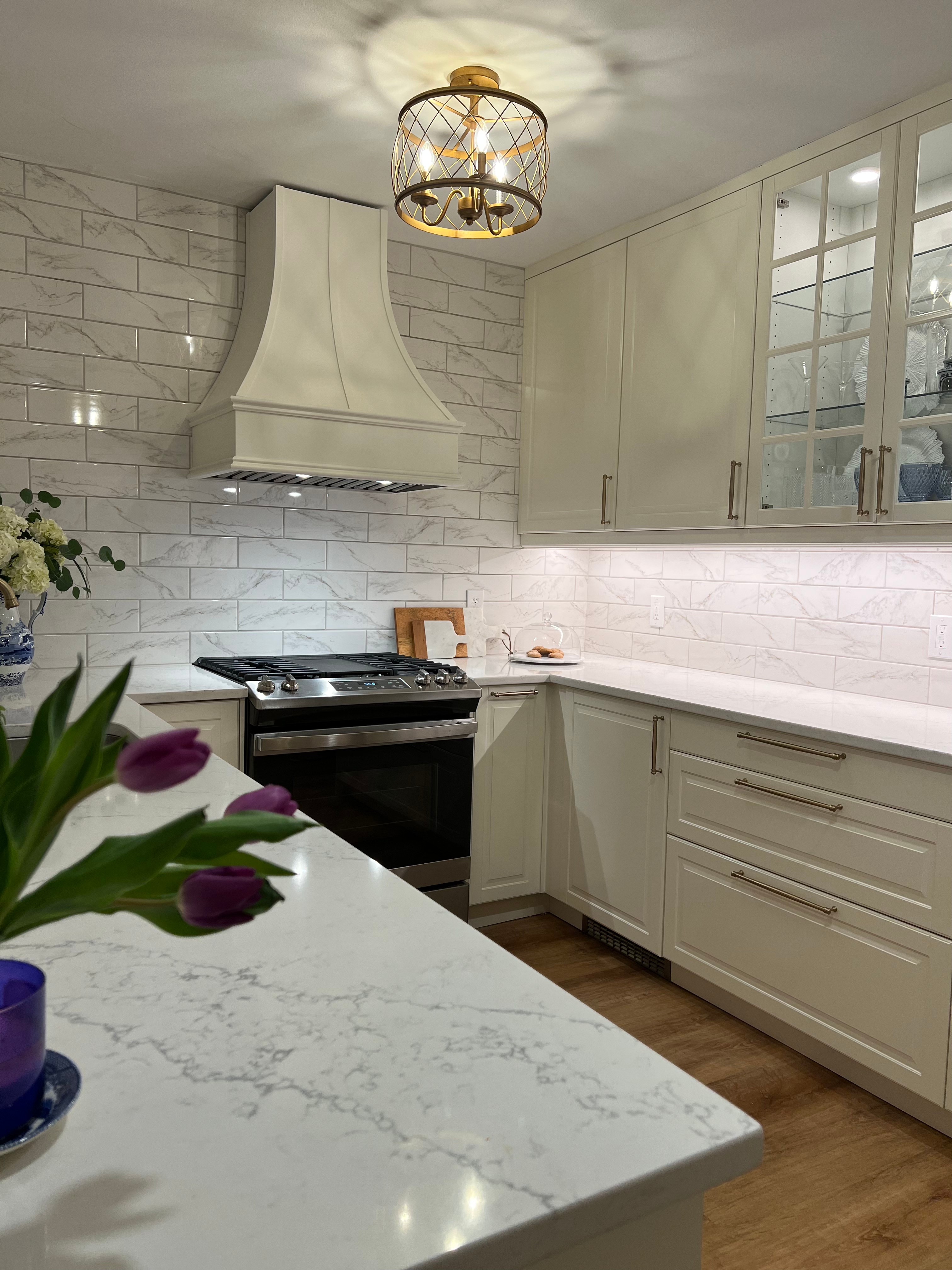 From the start, I really wanted the hood wall to be a statement, and I wasn’t sure doing a backsplash just 20″ up would have an impact. I also feared it would make the wall seem shorter by bringing your eyes downward.