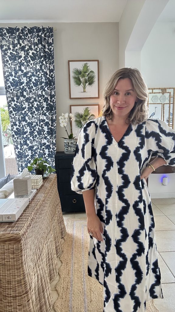 Here are the two I ordered: this bold blue and white pattern and the olive green embroidered one. The blue kaftan’s fabric is a bit more supple, more similar to my kaftan of yesteryear. The green one is nice, too, but slightly scratchy. I bet it will get softer with a few washes. I do love the neckline and embroidery on that one, so I’m still recommending it.