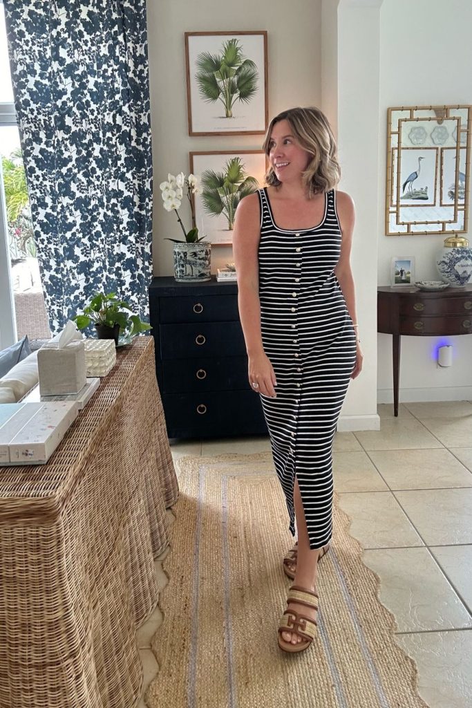 And I’ve had this dress for a few months now and still love it. It’s a tighter silhouette, but it’s cotton. I love the gold buttons!