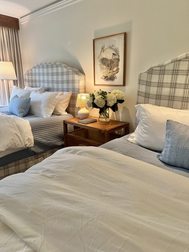 The condo has three bedrooms, and one of the bedrooms is large enough to fit two queen size beds. I was so excited when I found these beds on Wayfair because the price is incredible and it achieved the custom look I’m after, with headboards that match the bedskirts. I love the plaid pattern on them, very traditional and slightly Williamsburg. I envisioned an Americana bedroom, perfect for those interested in visiting Colonial Williamsburg and staying at our place. With two queen beds, this could be a room for the kids who stay here.