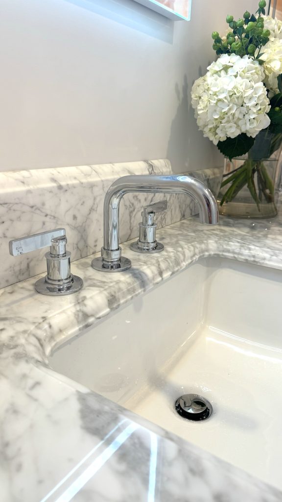 Aren’t they gorgeous? I love the look of chrome against marble. It’s such a classic look. These faucets also have this notched detail that reminds me of trim work. We’re so pleased with them.