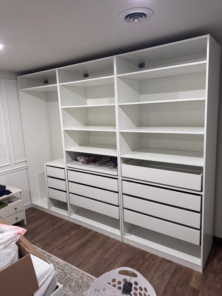 This IKEA PAX renovation completely transformed how we use our bedroom. Before, we had a single dresser with nothing above it, which meant a lot of wasted space. By replacing our dressers with the PAX system, we were able to fully maximize both the vertical and horizontal space in the room—and ultimately get rid of both of our dressers entirely.