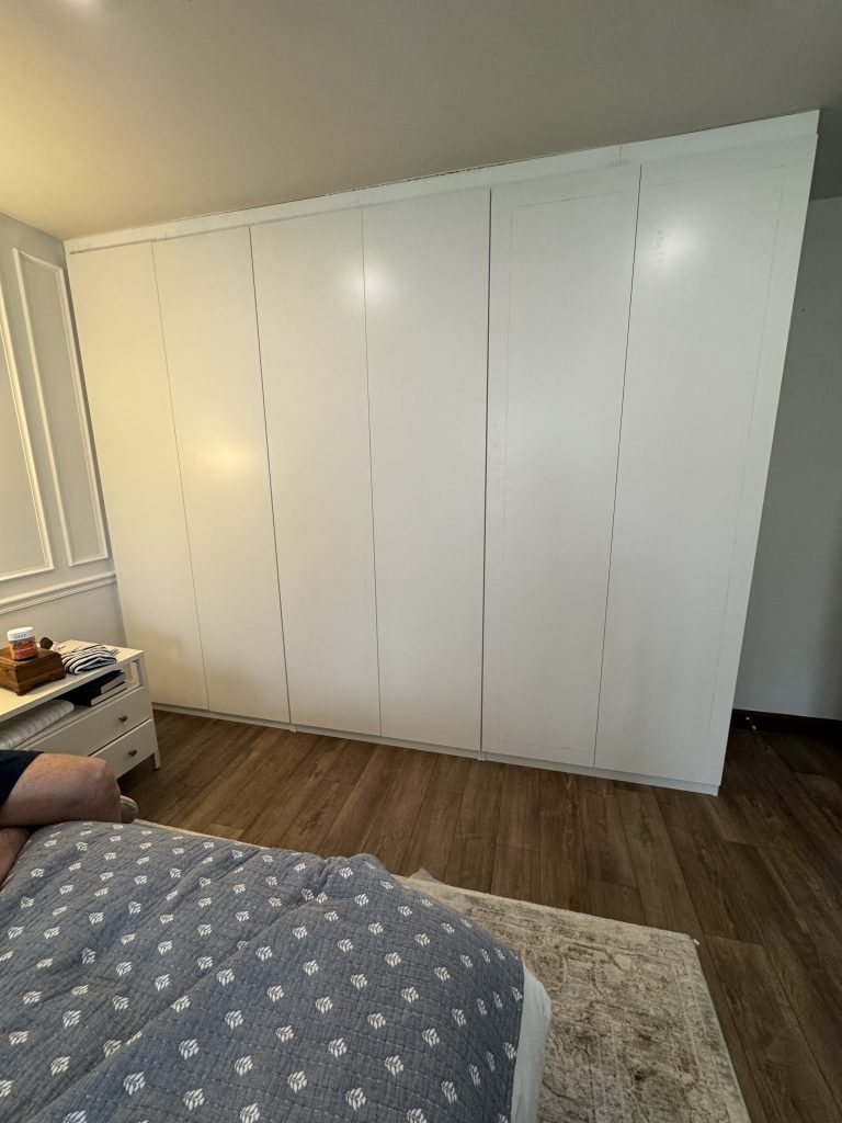 The final step was installing crown molding at the top, using the same molding that runs throughout the bedroom. This truly made the wardrobes feel like they’ve always been part of the house.