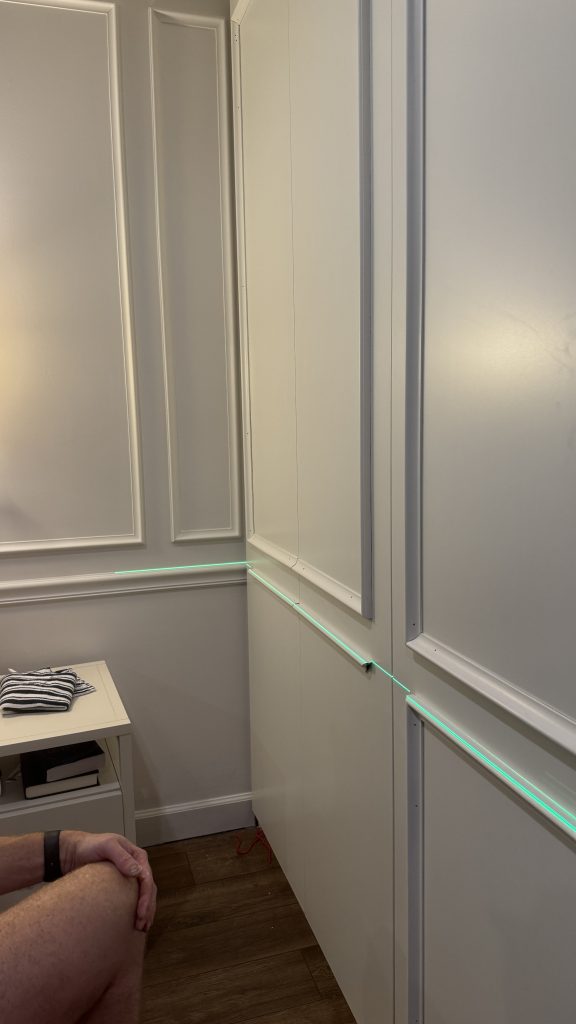 Even if you measure carefully, floors and ceilings are rarely perfectly straight. A laser level allows you to establish one consistent, perfectly straight line across the entire wall and build everything off of that. Once the first horizontal piece was installed, all of the other trim pieces were built from that reference point.