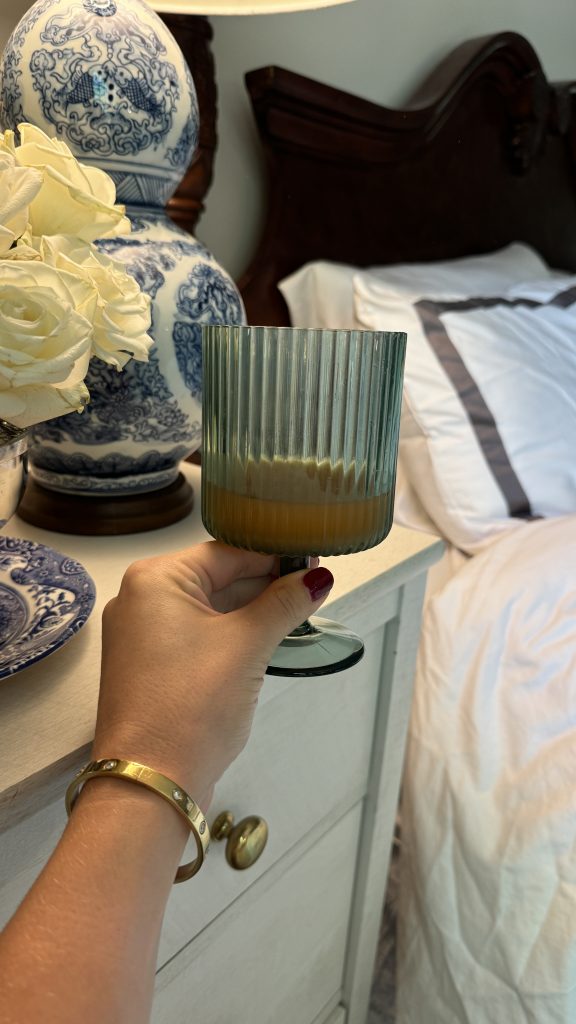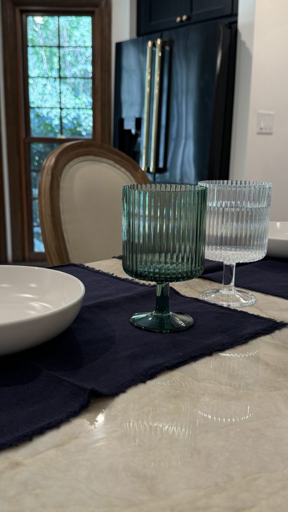 I set up a lunch for my dad over the weekend, and we used the green for iced tea and the white goblets for water. I also used RE/FINE’s linen placemats. It was such a classic, masculine look for this birthday lunch.