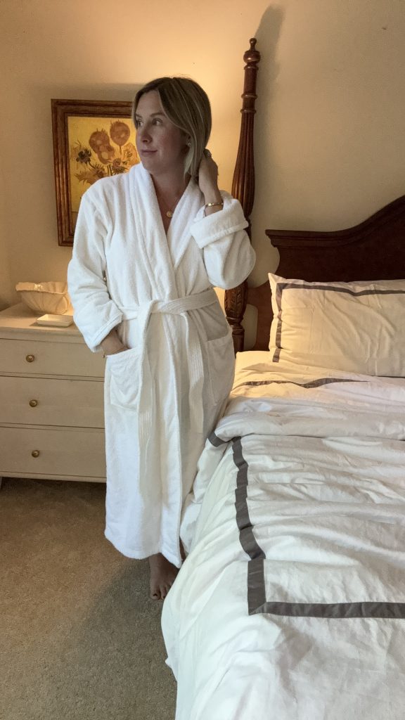 Last but not least, I had to try the robe from RE/FINE. I love a good robe and have been known to live in one past noon. I also would like to stock our vacation rental with luxury robes, and I think I found just the ones. This robe feels like you’re wrapping yourself in a warm towel or blanket. It’s thick and luxurious, everything I wanted in a robe. I may even bust out my embroidery machine to add my monogram to it.