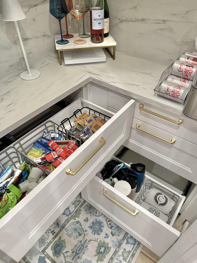 One snag we hit was inventory of the cabinet. They only had one in stock at our store, but they also had a similar one with different drawer depths. We snagged this one too for the other side, and I’m so glad we did because that tall drawer at the bottom is perfect for water bottles.