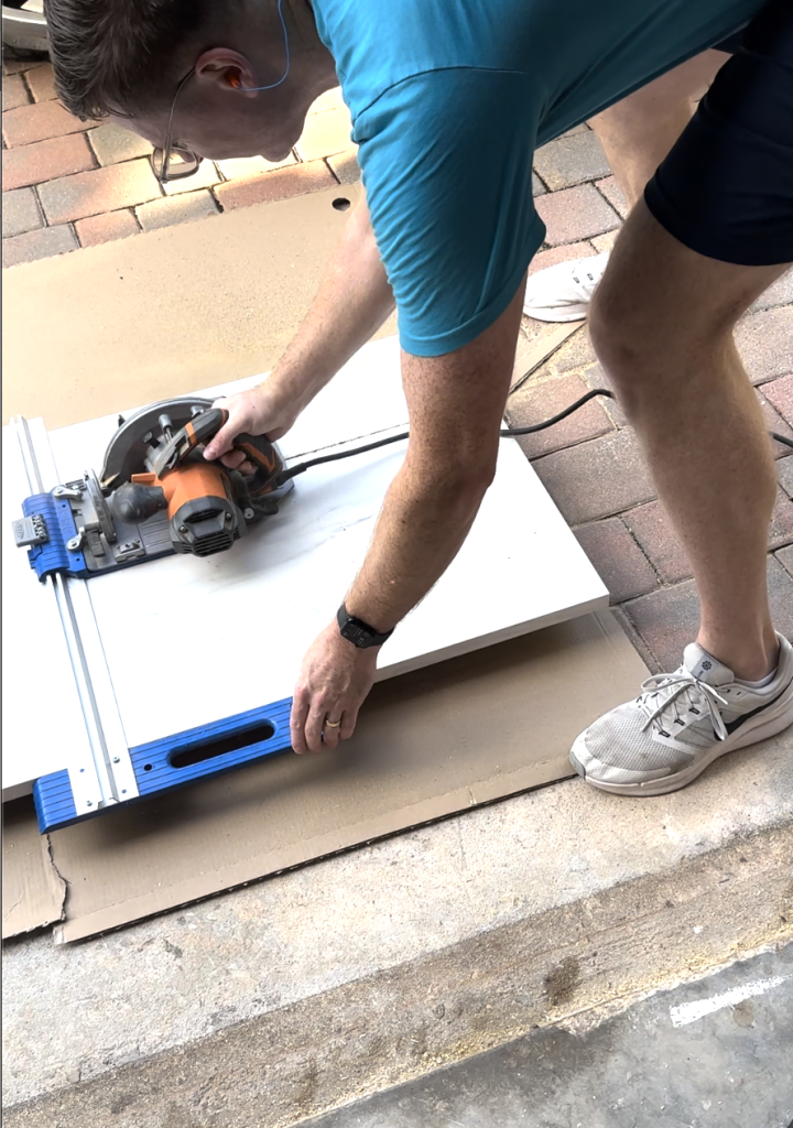 While I was doing all of the editing, Mike was working on installing the cabinets and shelves. Luckily, the shelves didn’t require too much editing to fit our space. Mike was able to saw off a bit of the end. He just placed that sawed off side against the wall, but if you’re making a floating shelf that’s visible, you can try to reuse the cap on the end.