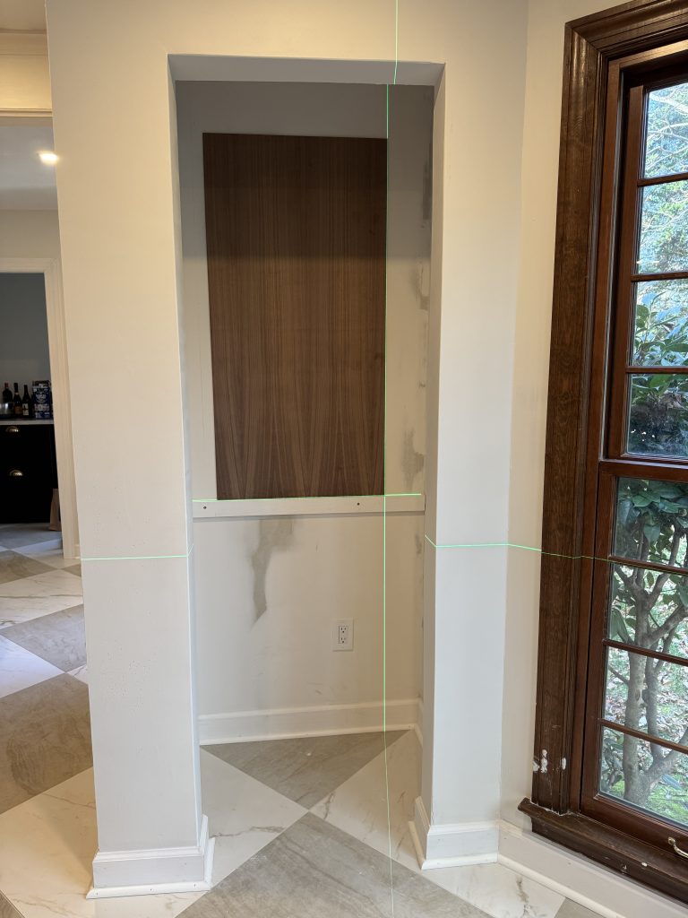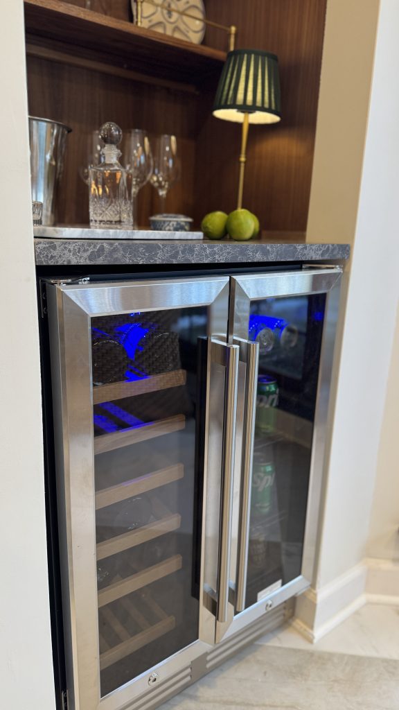 One thing we didn’t have in our kitchen is a wine fridge. We had a wine and beverage refrigerator in our Florida house that we loved, so we decided to recreate it here! This time, we also wanted to add some shelves above it for our glassware.