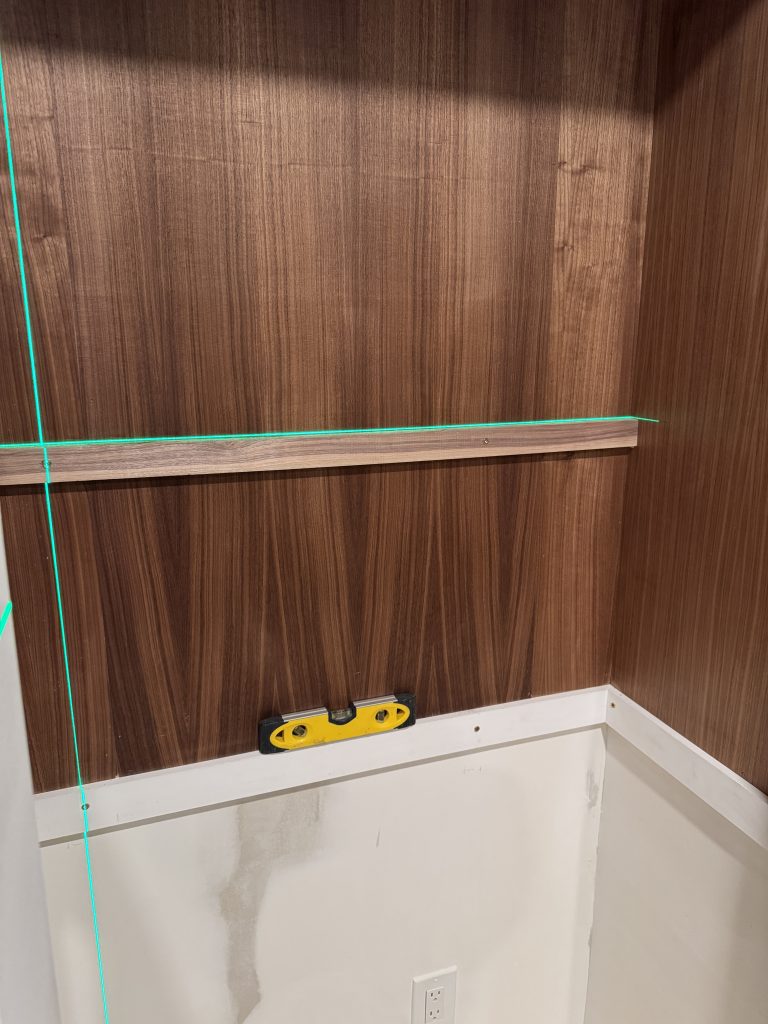 For the back wall, he screwed a small support cleat into the wood and wall’s studs. This is why it’s important to mark where the studs are before you cover the wall.