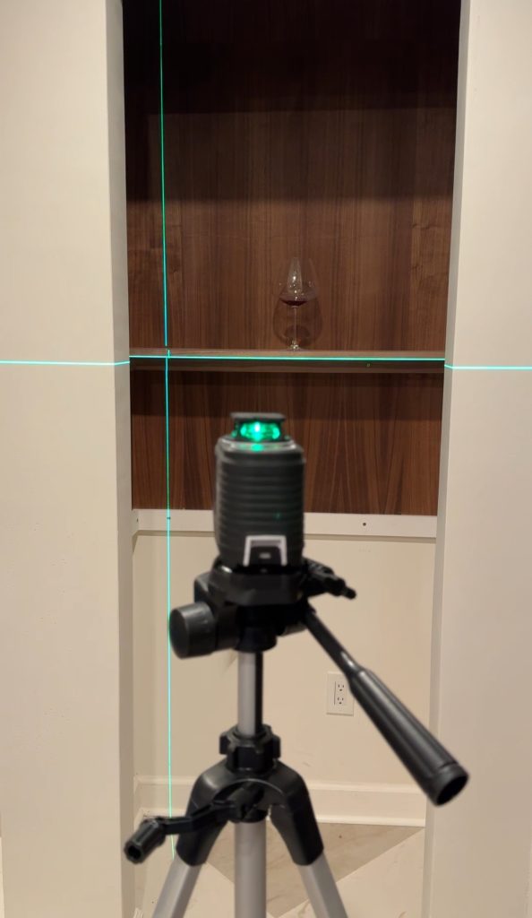 Determine the height and spacing of your shelves. I knew I wanted this to be a bar, so I made sure that my first shelf was at least high enough for a wine bottle to fit under. I also held up my coffee maker, in case I want that in the future. Our first shelf is 19″ above the countertop. From there, I wanted my shelves to hold wine glasses, so I placed a wine glass on the first shelf, and we made the second shelf 13″ above the first shelf, and so forth.